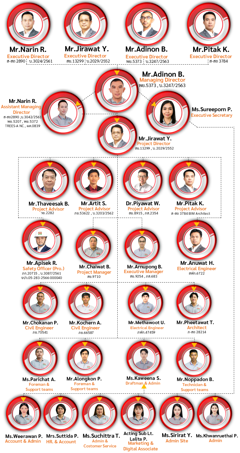 We are a team of Engineers, Architects and building inspectors that has license for professional practice, Juristic person type awarded by Council of Engineer, registered number Nor. Tor. 1868/64 with Architectural license juristic person type awarded by Council of Architects, registration number Nor.036-65 with building inspection certificate, juristic person type awarded by department of public works and town & country planning, registered number Nor. 0329/2564. Our clients can rely on standard of quality control of Engineering and Architectural inspection. Our team consists of senior Civil Engineers, Professional Civil Engineer, Professional environmental Engineer, Professional Electrical Engineers, Professional Mechanical Engineers, Professional Architect and building inspectors.