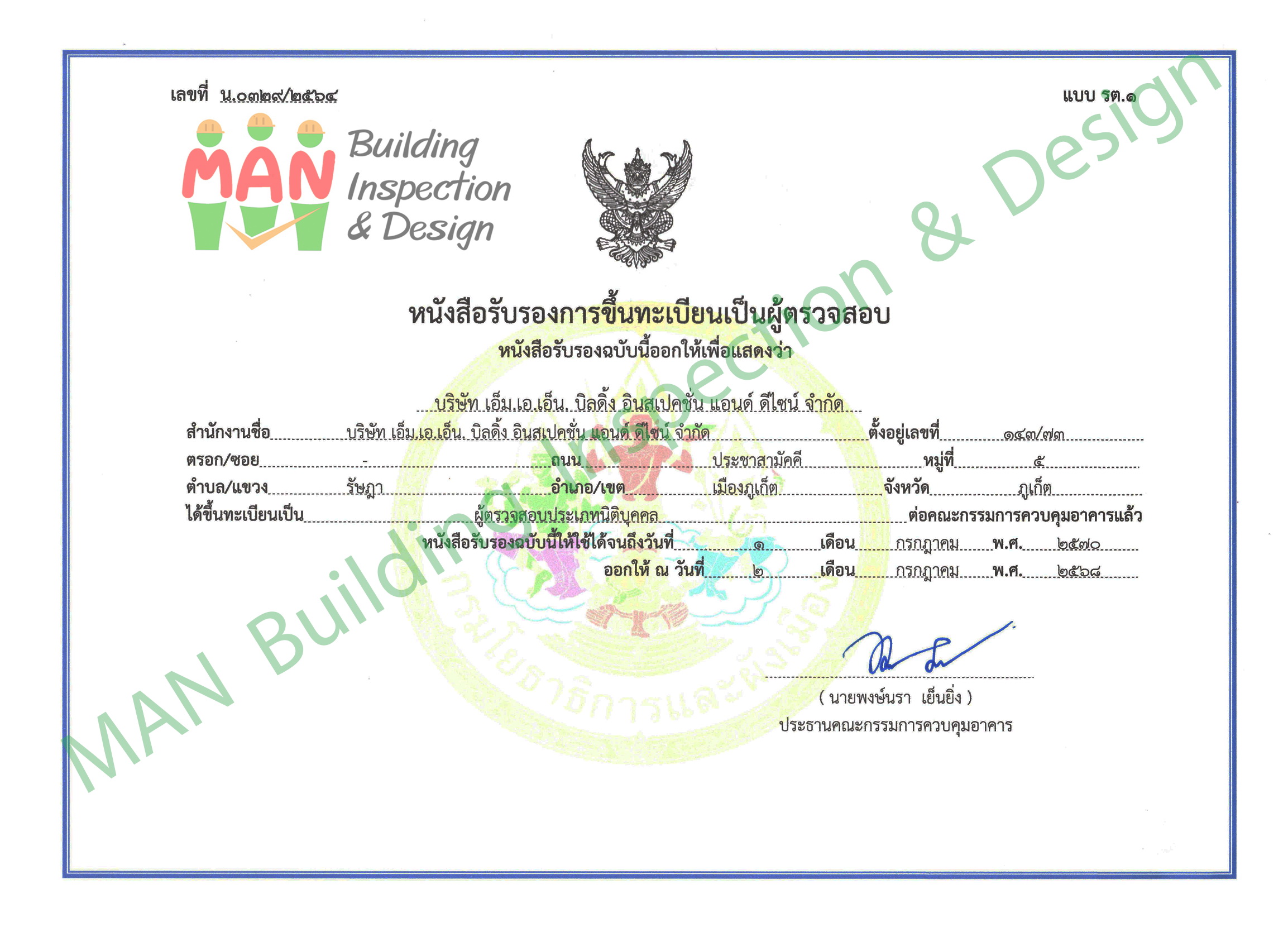 หนังสือรับรองการขึ้นทะเบียนผู้ตรวจสอบอาคาร